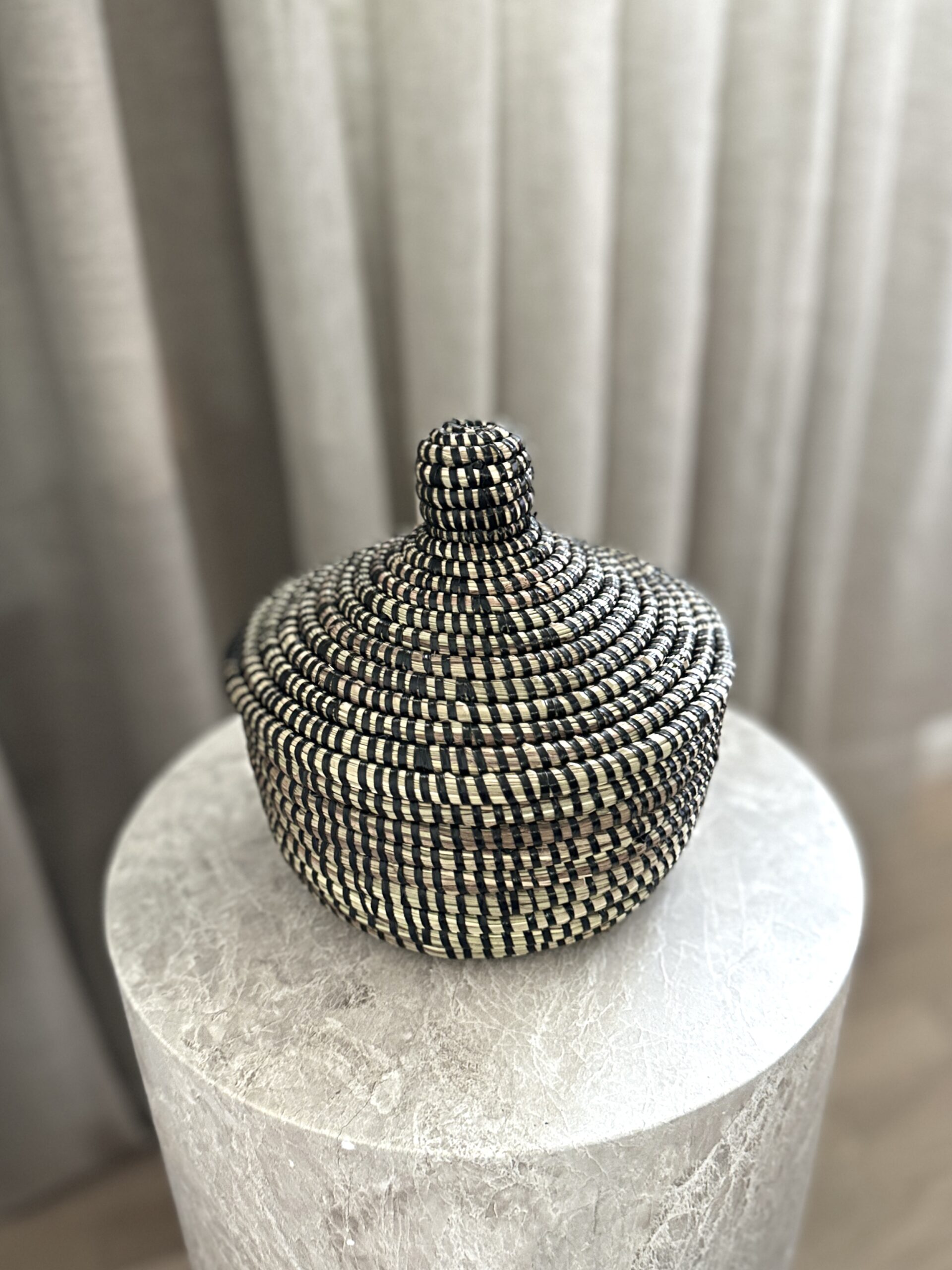Liten afrikansk kurv med sultan lokk i hvit, Et vakkert dekor element til hus og hytte. Passer perfekt til å romme småting som trengs å gjemmes bort. Her kan du gjemme telys, eller ting på baderommet.