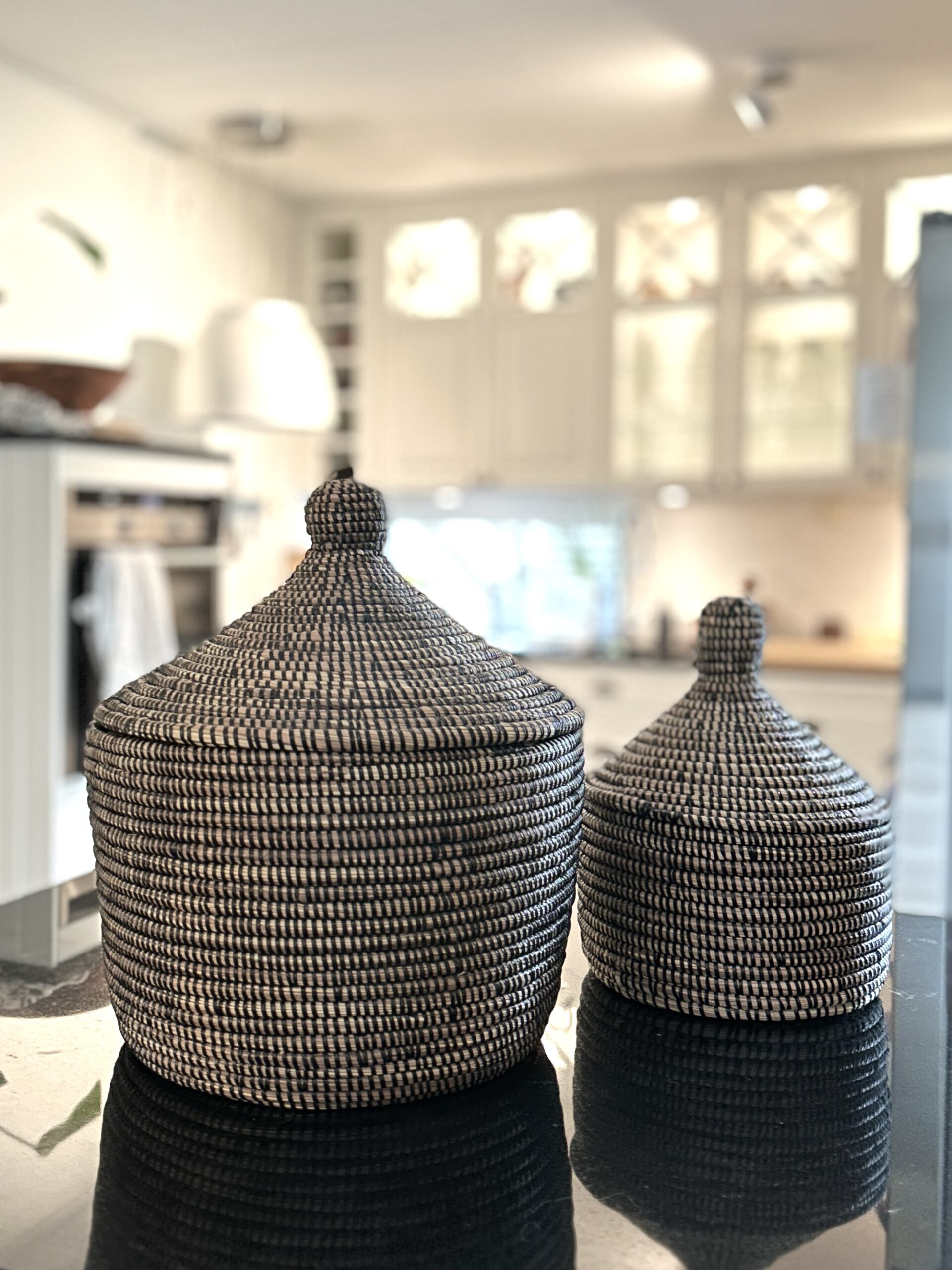 Afrikansk kurv er håndlaget av kvinner i Senegal, kurvproduksjon er ofte eneste inntektskilden de har. Stråene hentes nær savannen, og resirkulert plast brukes som tråd i flettingen.
