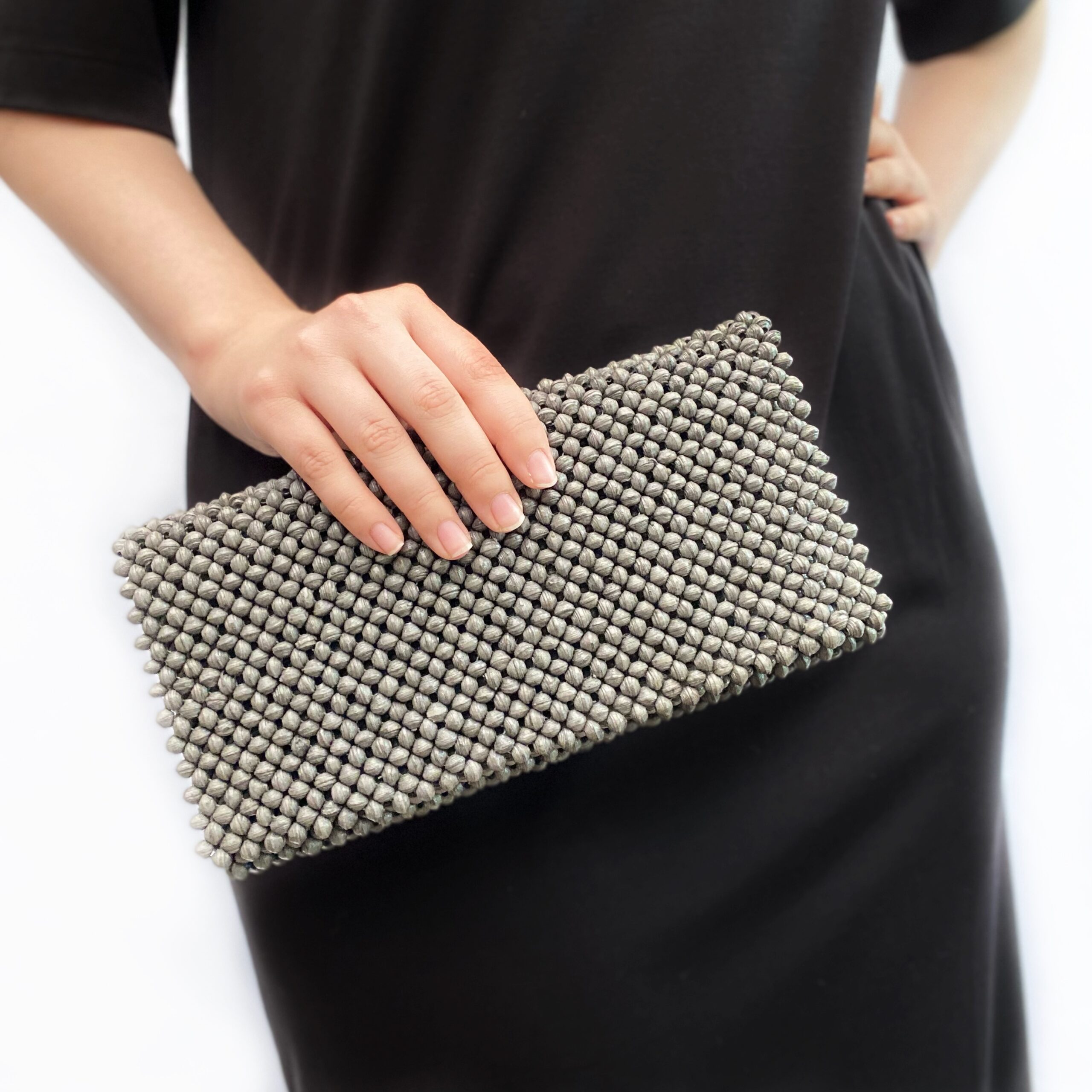 Wilma: håndlaget selskapsveske, clutch. Passer til fest og hverdag. Håndlaget av rullede perler, hver veske er unik. Den har hemper til skulder rem.