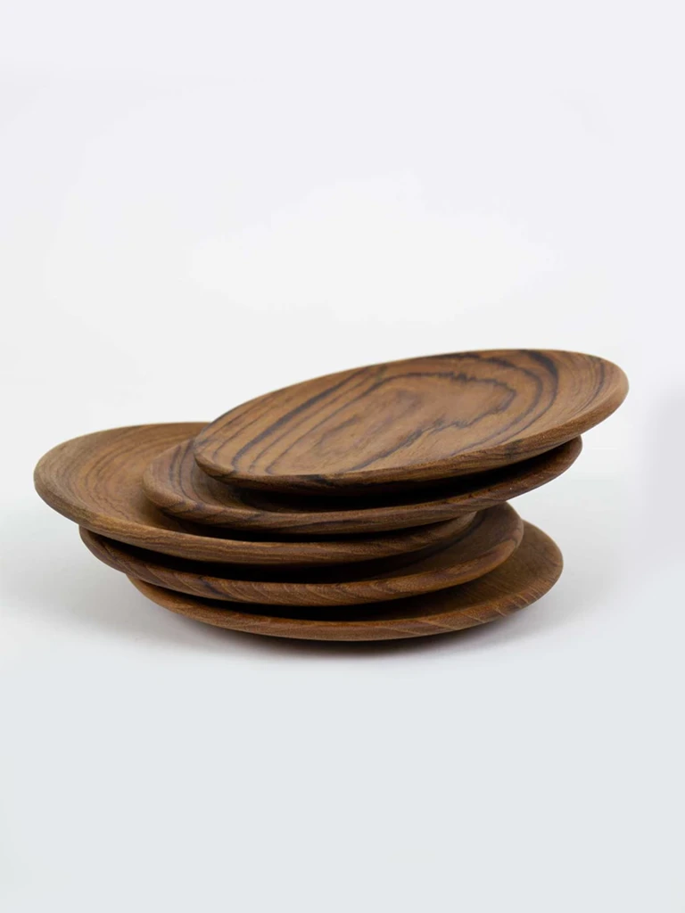 Denne tre tallerken kan brukes til kuvert dekorasjon på et festpyntet bord – eller som mindre serveringsfat til tapas. Dette lille fatet er produsert av overskuddslager fra de store teak produksjonene. Det blir brukt røtter og andre deler av teak trær ikke kan benyttes til industrien til å lage teak tallerken.
