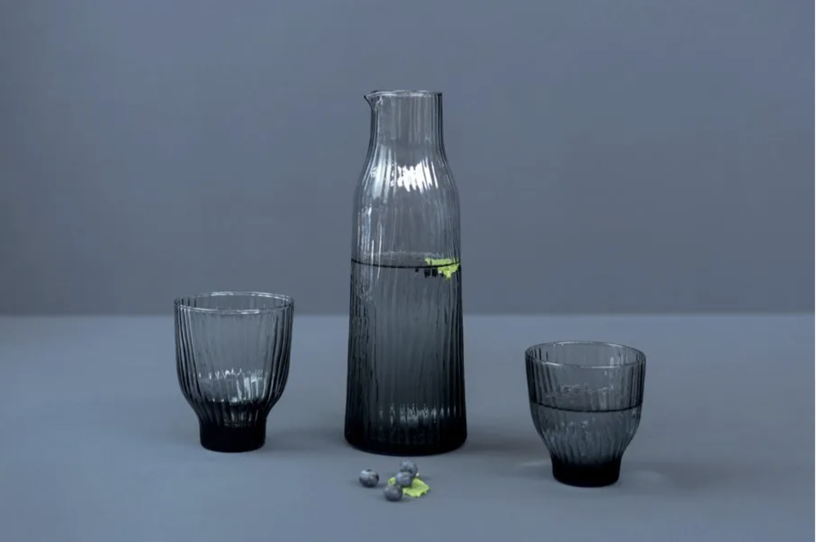 Kinta Amnis karaffel er munnblåst i krystallglass – kolleksjonen har et bølgemønster som gir både karaffelen og glassene et godt grep. Både vannkaraffelen og glassene han en nydelig form som ligger godt i hånden.