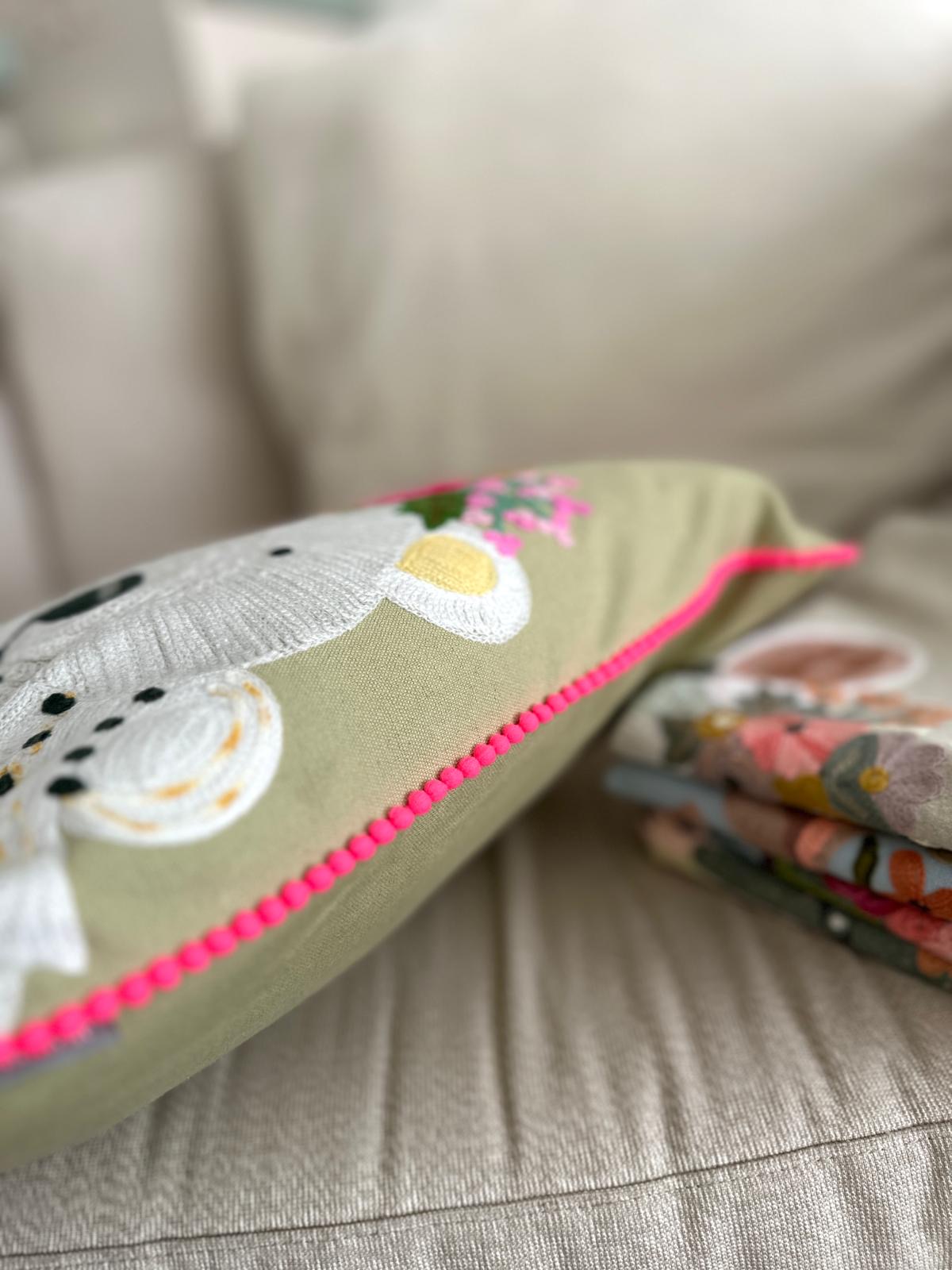 Her får du alt du ønsker i en pute med naturlige og trygge materialer. Det er en fantastisk håndlaget kvalitet til hvert eneste motiv som er en blanding av applikasjon og broderi. Herlige farger på pompom pipingen i lekre farger.