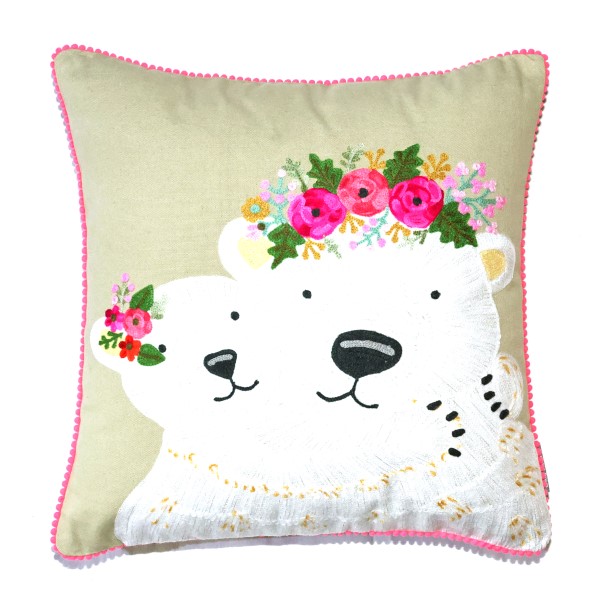 Only Natural pyntepute – Isbjørn – er en søt pute med mye sjarm. Vi elsker disse håndbroderte putene med nydelige motiver i bomulls fløyel , herlig pompom piping (kantsnor) og myk bomulls kanvas.