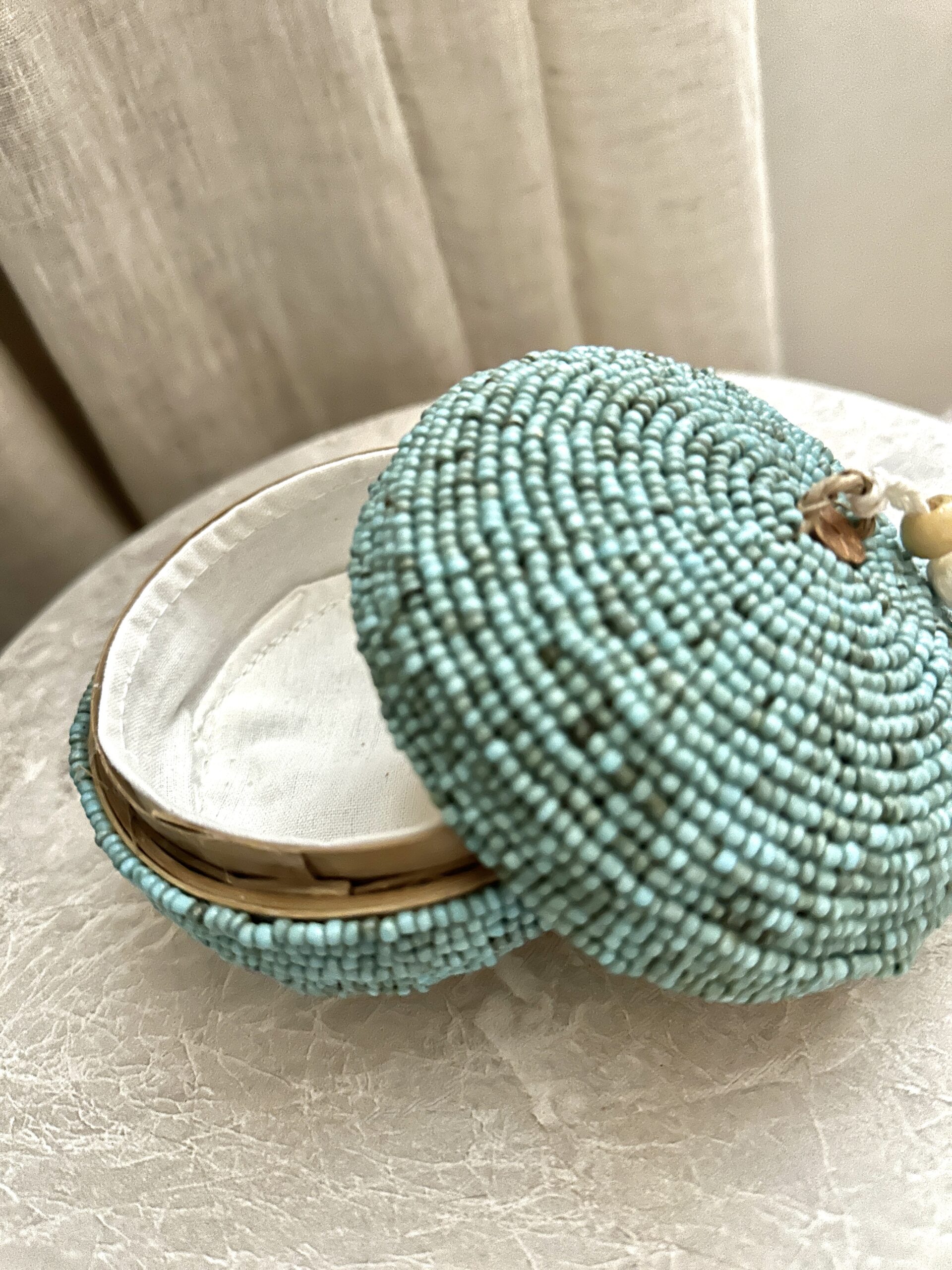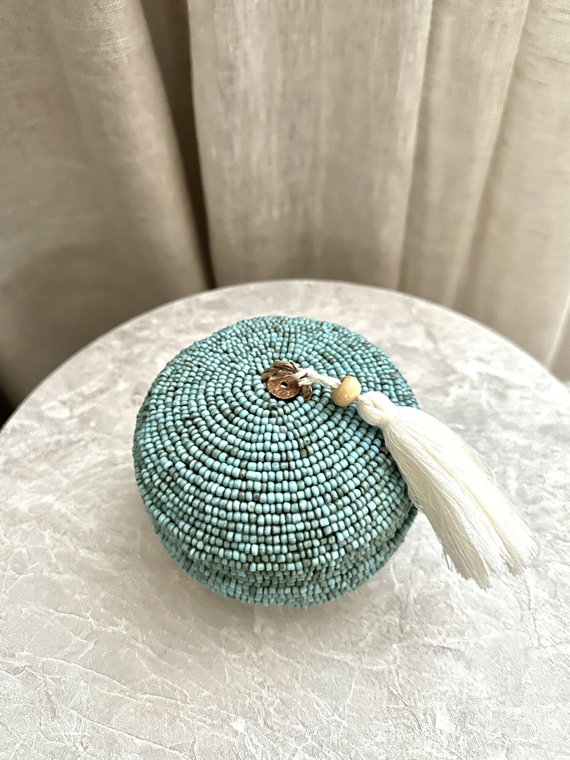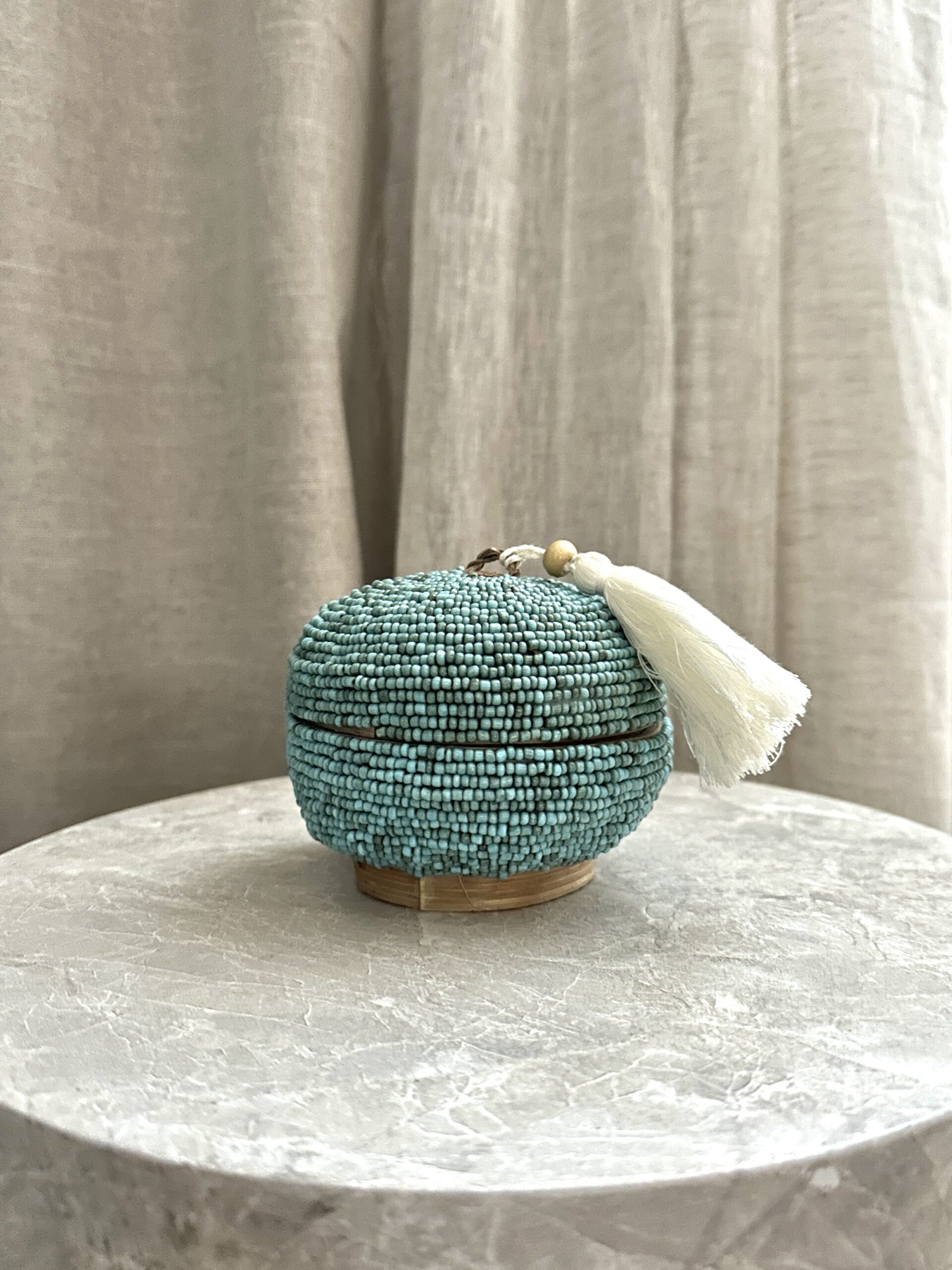 Umah smykkeskrin – Liten rund boks – bambus med perler – turkis