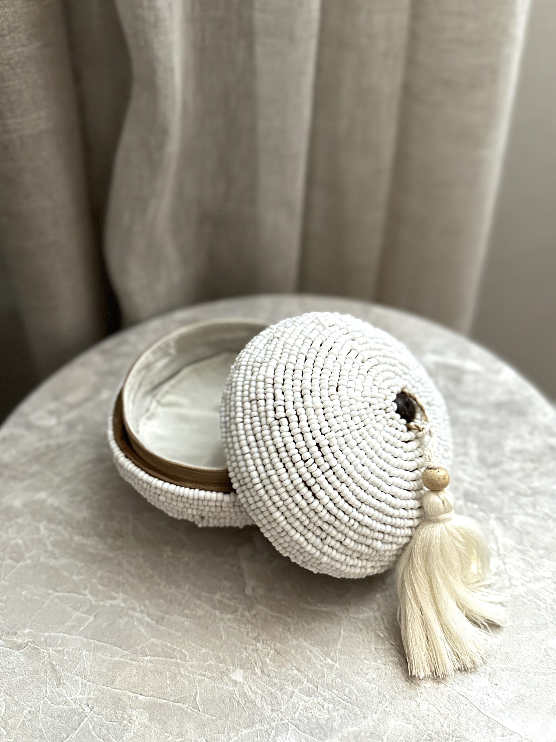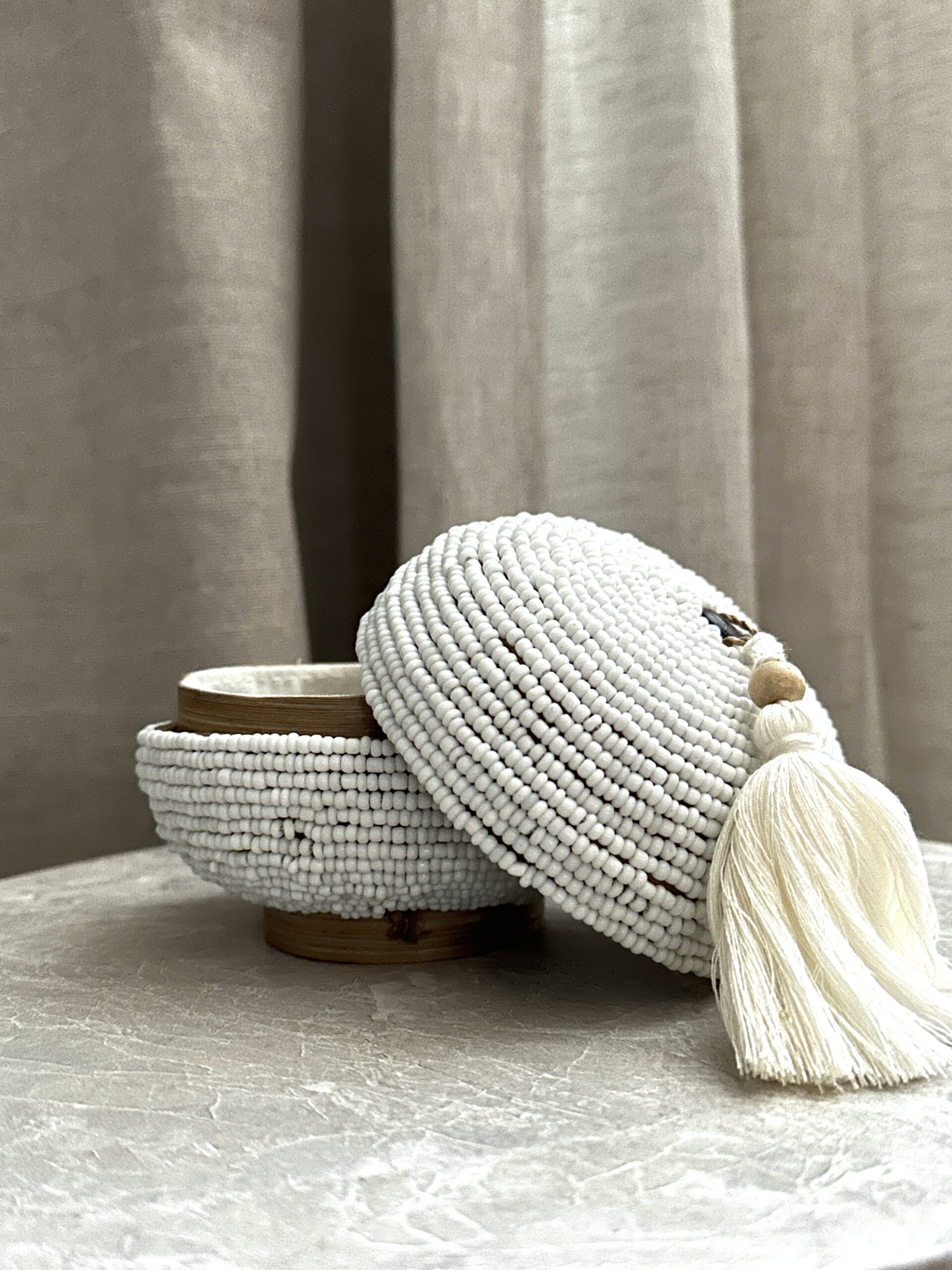 Umah smykkeskrin – en liten rund boks laget av bambus med perler og en nydelig liten dusk. Lekker i ethvert miljø. Bruk den som oppbevaringsboks der du vil ha et vakkert skrin som kan skjule smårot eller det fineste du har. For eks hårstrikker på badet, eller hva med fyrstikkeske og telys på bordet.